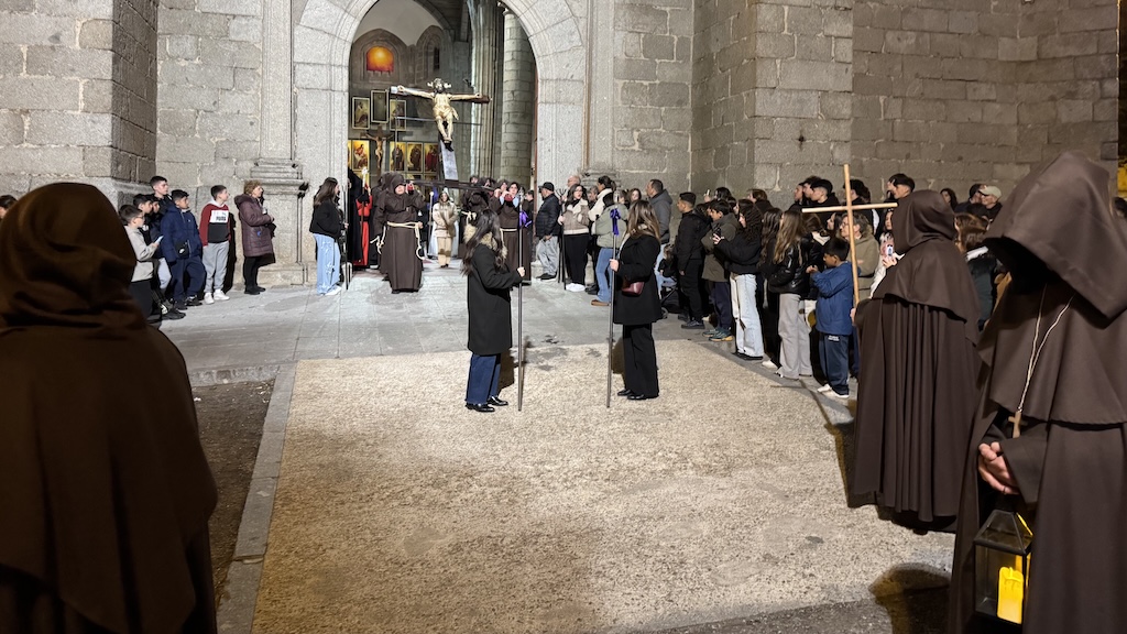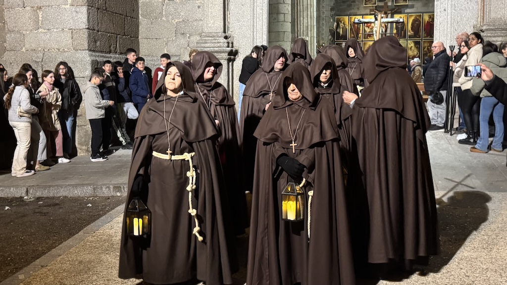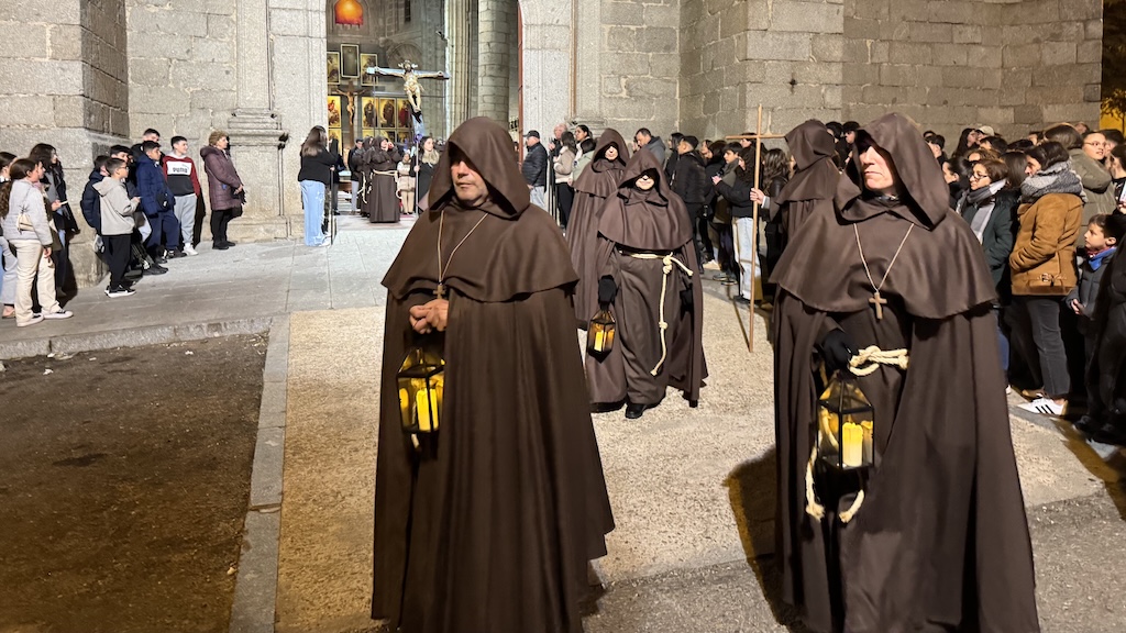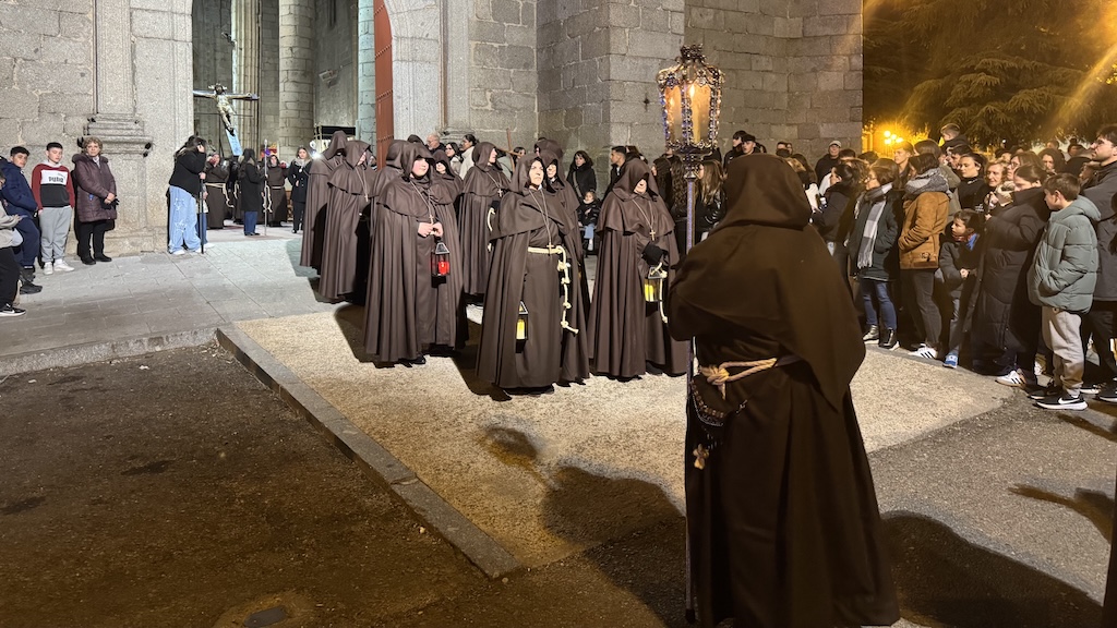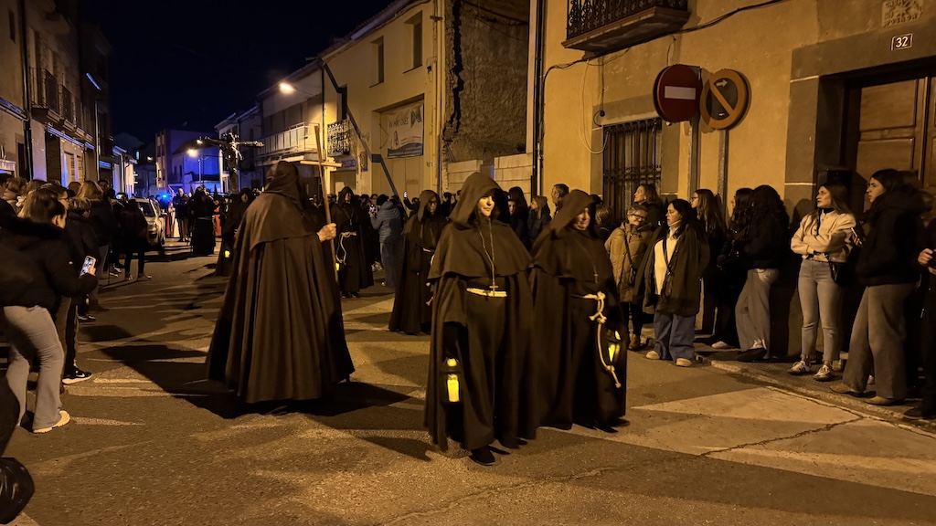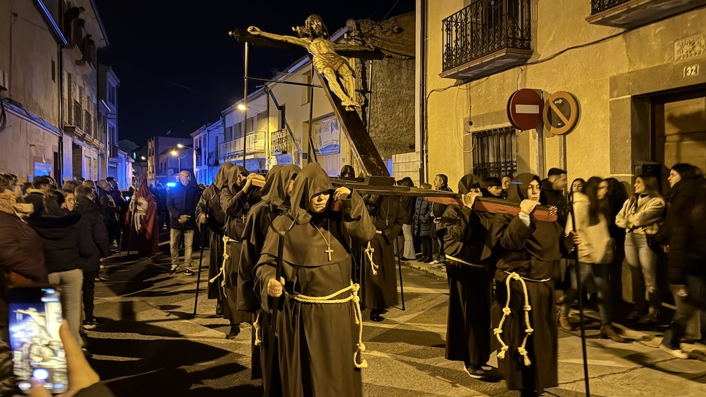 Cientos de personas han acompañado a la imagen del Cristo de San Luis en la procesión anoche del acto penitencial del Santo Cristo, en la segunda procesión de la Semana Santa de Peñaranda. Una veintena de cofrades con túnica y capa monacal, capucha y escapulario marrón, y farol de la mano, arroparon a la imagen desde la parroquia y hasta el cementerio donde tuvo lugar una oración y meditación sobre la Muerte y Resurrección.