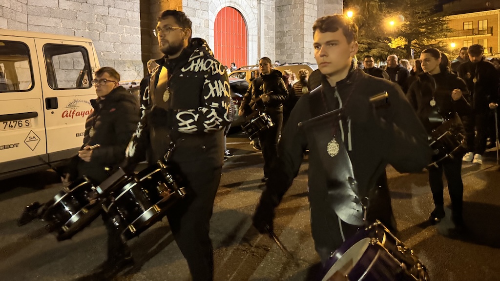 El desfile procesional contó solo con el acompañamiento de la percusión de la banda de tambores y cornetas de la Hermandad de Cofradias. Este grupo se ha encargado de marcar el paso de los hermanos de carga durante el recorrido que han cerrado representantes de las cofradías de Peñaranda ataviados con sus trajes.