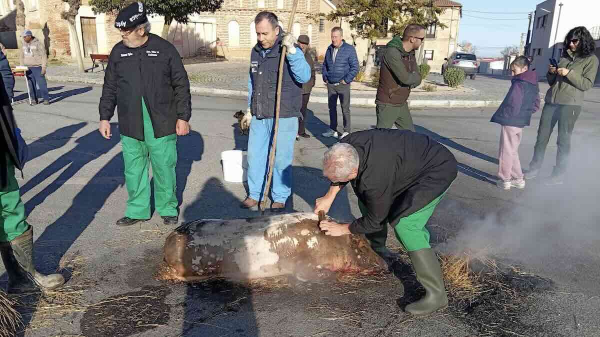La matanza tradicional ha comenzado a las diez de la mañana con los trabajos tradicionales de la matanza. Varios vecinos del pueblo se han encargado de llevar a cabo las labores propias de esta costumbre. A lo largo de la mañana, los asistentes han podido disfrutar de aguardiente con perronillas y de una degustación de hígado que «ha gustado mucho».