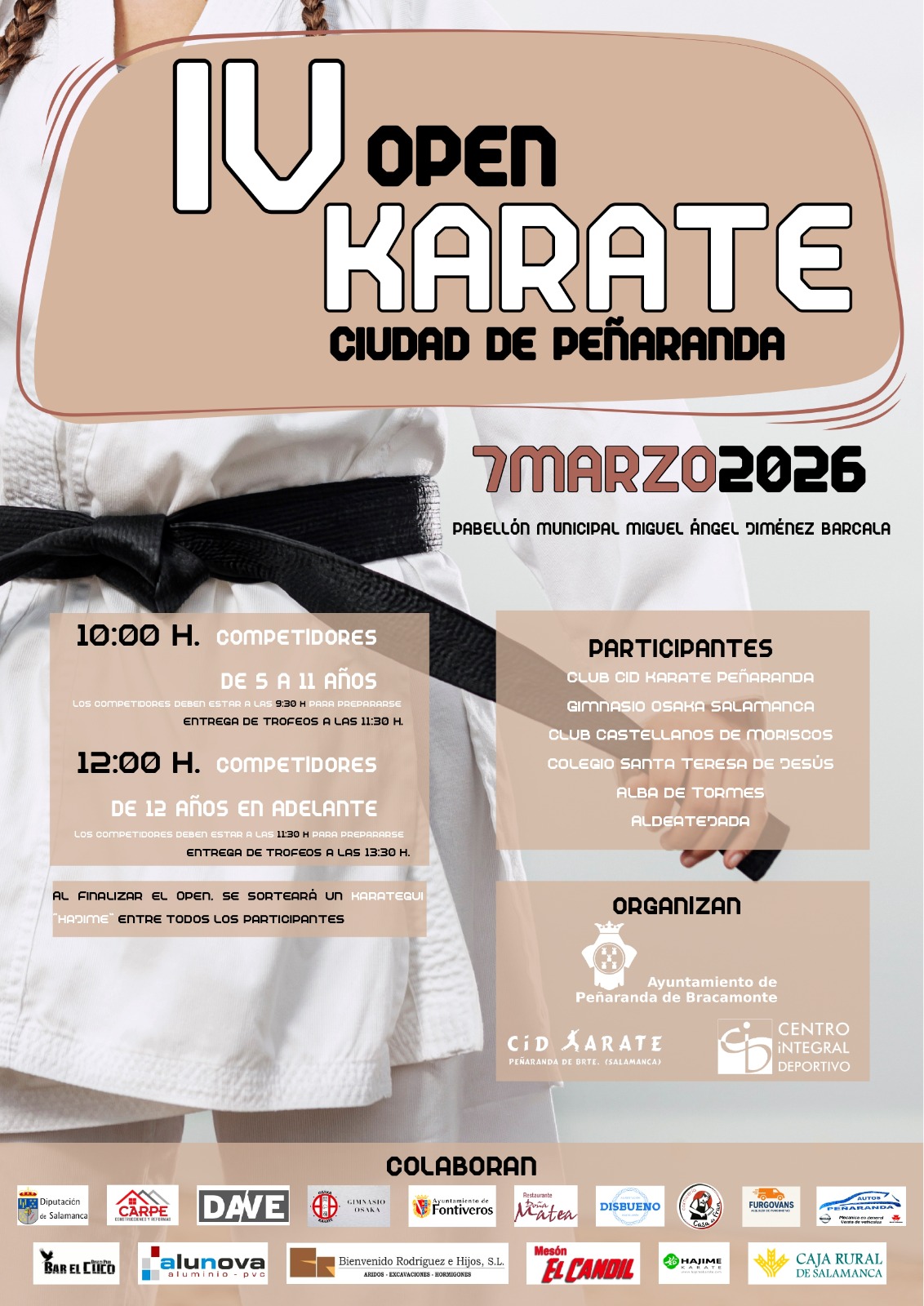 El Club de karate CID, junto al Ayuntamiento de Peñaranda de Bracamonte y el Centro Integral Deportivo, han organizado el IV Open de kárate Ciudad de Peñaranda, que se celebrará el próximo 7 de marzo en el pabellón municipal Miguel Ángel Jiménez Barcala.