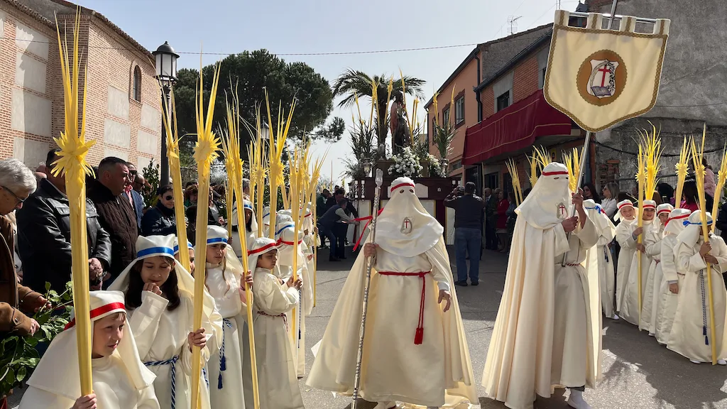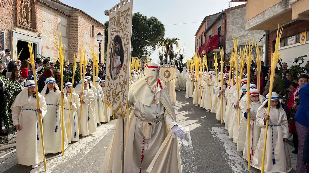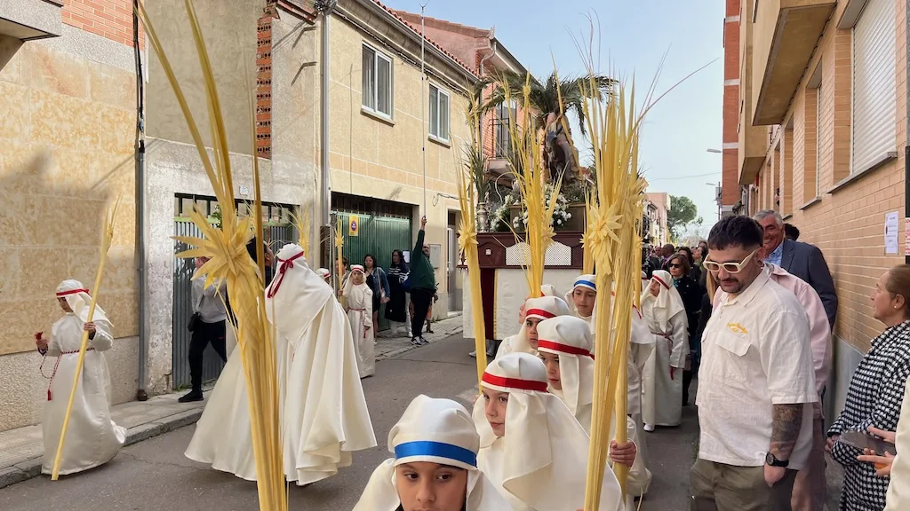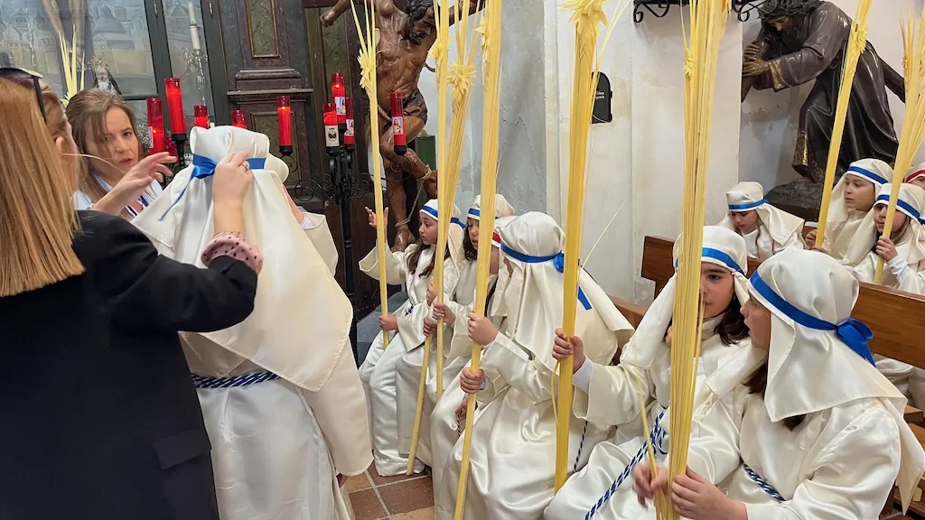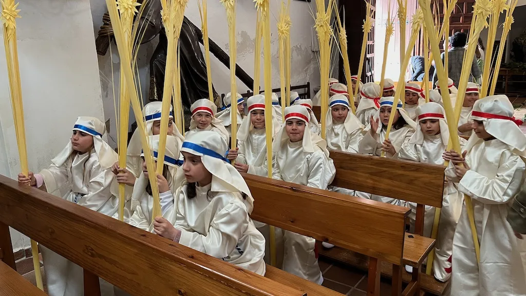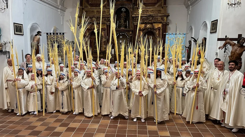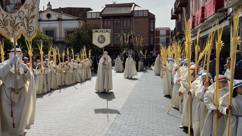 Los niños, que se preparan este año para recibir el sacramento de la Primera Comunión, han participado en la procesión acompañando a la imagen de La Borriquilla que ha sido portada a costal por los hermanos de carga y costaleros de diferentes cofradías. Los más pequeños han estado vestidos con túnica y tocado blancos, cinta azul o roja y han portando una gran palma en un desfile coordinado por la cofradía Jesús Amigo de los Niños.